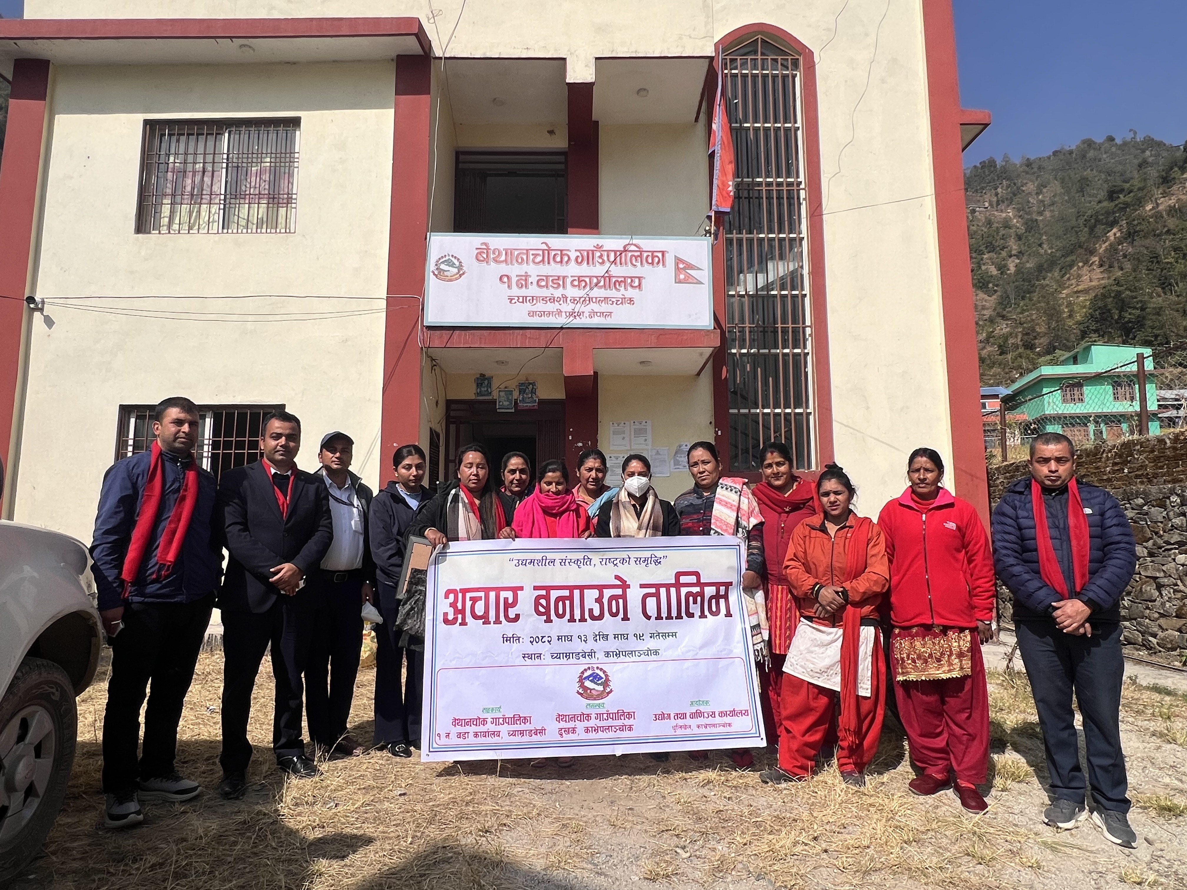 उद्योग तथा वाणिज्य कार्यालय, काभ्रेपलाञ्चोकको आ.व.२०८२।०८३ को स्वीकृत बार्षिक कार्यक्रममा रहेको अचार बनाउने सम्बन्धी ७ दिने सीपमूलक तालिम बेथानचोक गाउँपालिका वडा नं. १ च्यामरुङवेशीमा मिति २०८२।१०।१३ गते देखि सञ्चालन भई मिति २०८२।१०।१९ गते सम्पन्न भयो।