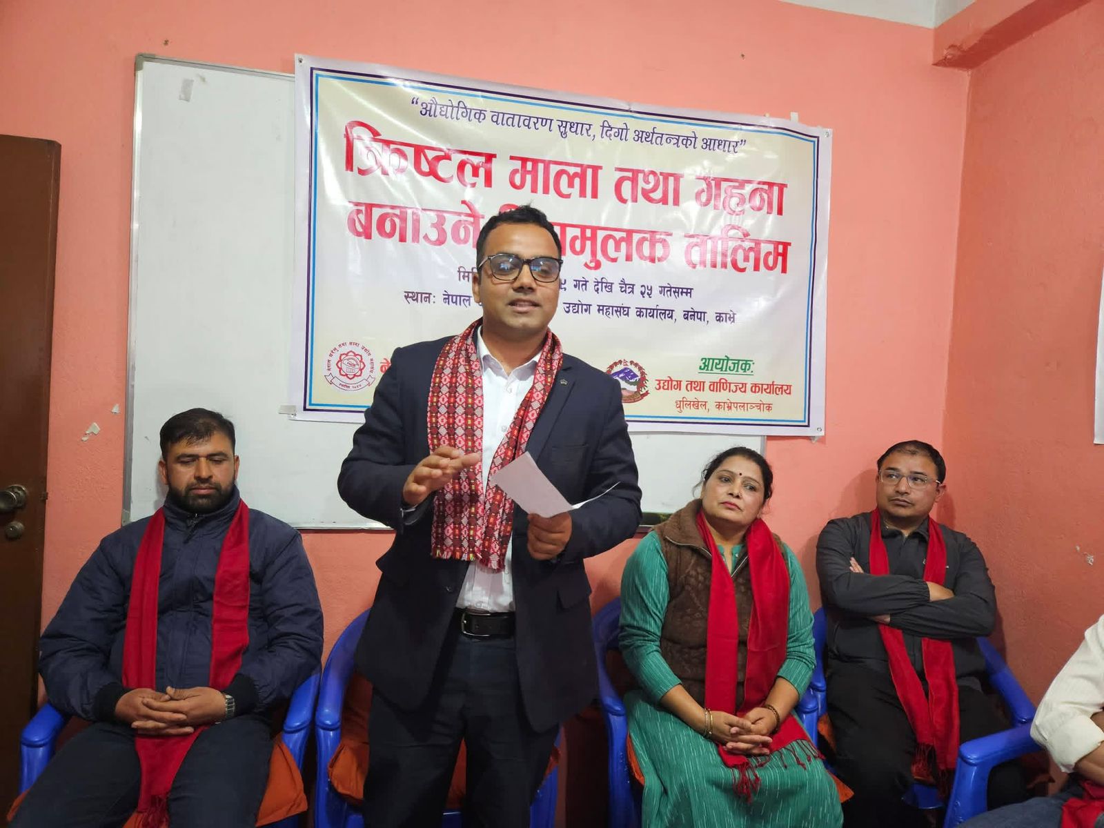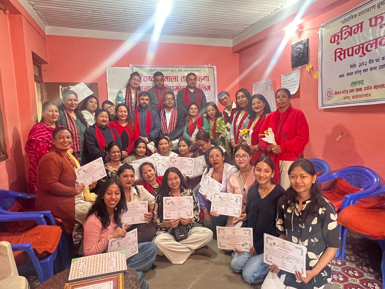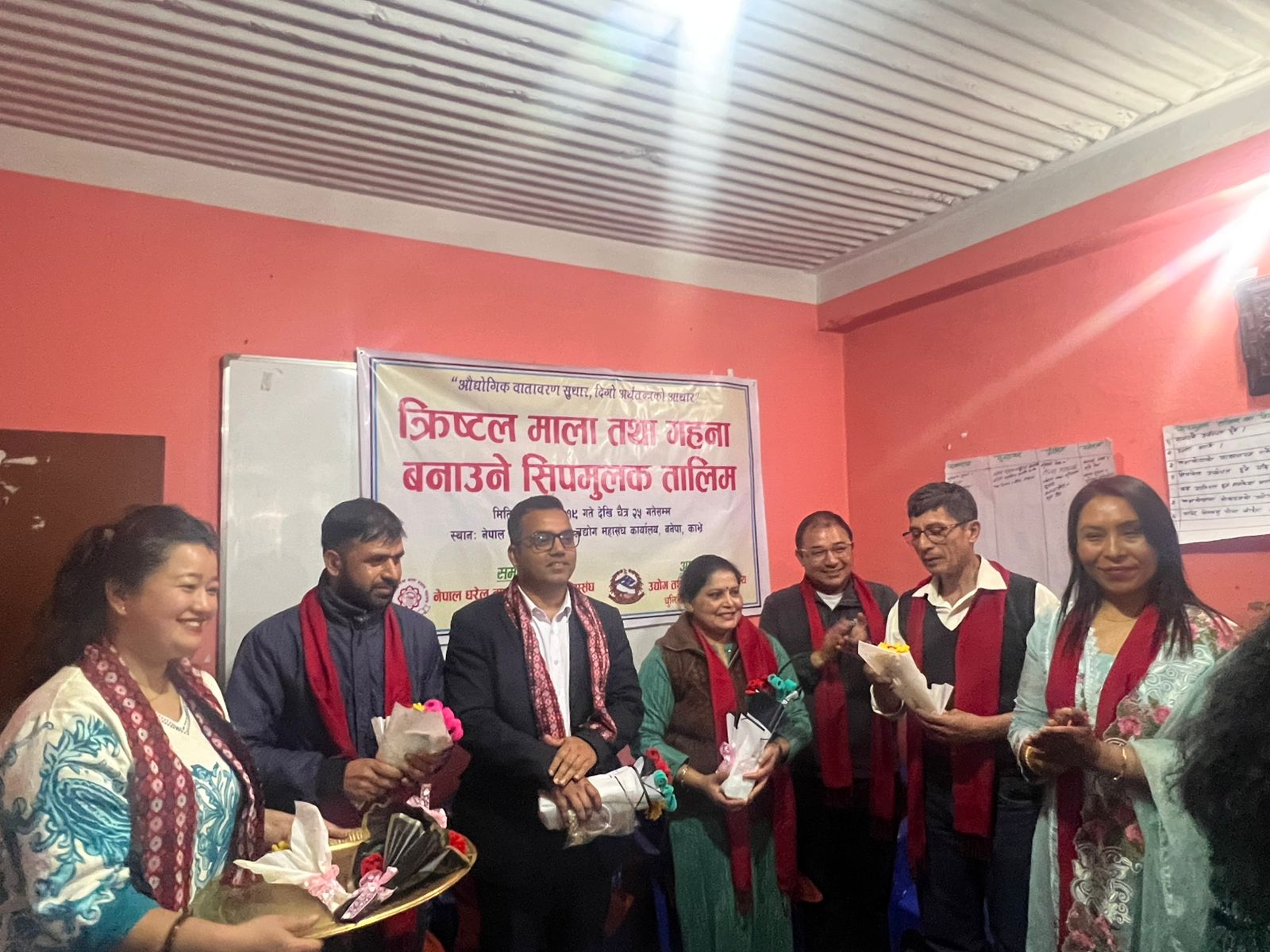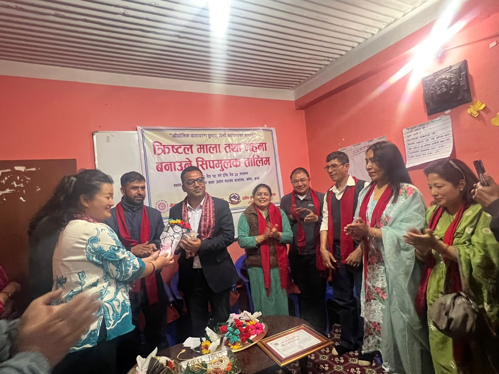 उद्योग तथा वाणिज्य कार्यालय, काभ्रेपलाञ्चोकको आयोजना तथा नेपाल साना तथा घरेलु महासंघ, बनेपा, काभ्रेको सहकार्यमा मिति २०८२।१२।१९ गते देखि मिति २०८२।१२।२५ गतेसम्म क्रिस्टल माला तथा गहना र कृत्रिम फूल बनाउने ७ दिने सीपमूलक तालिम सम्पन्न भएको