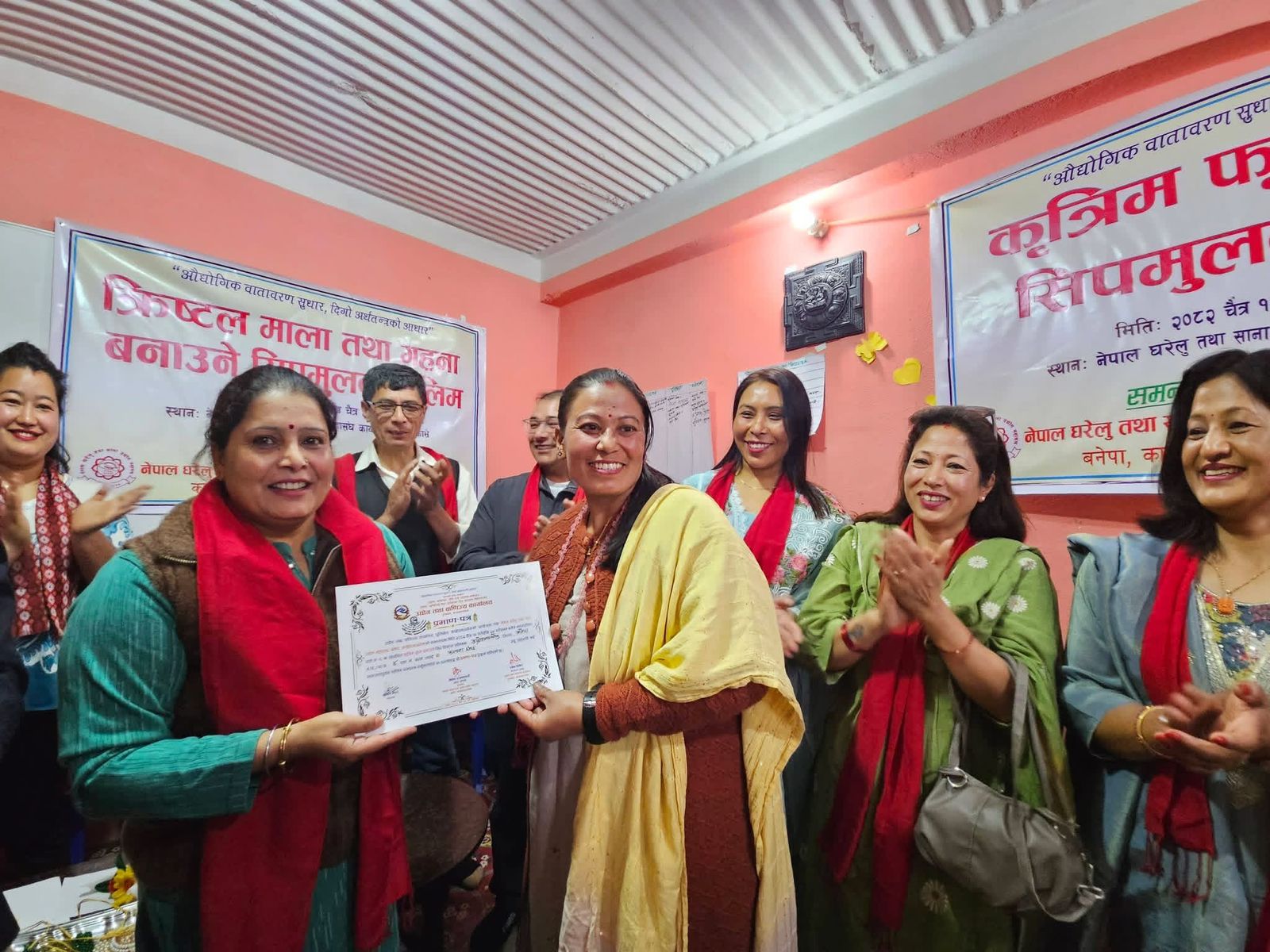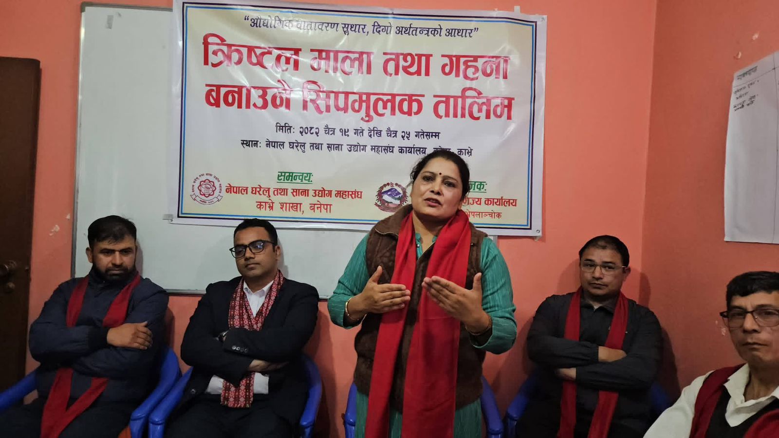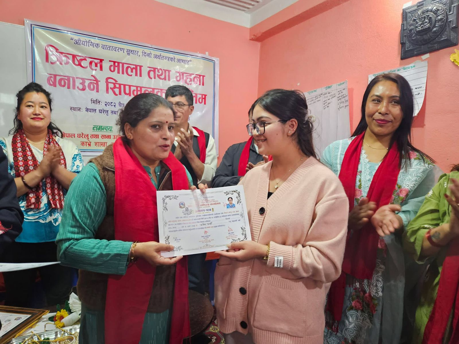 उद्योग तथा वाणिज्य कार्यालय, काभ्रेपलाञ्चोकको आयोजना तथा नेपाल साना तथा घरेलु महासंघ, बनेपा, काभ्रेको सहकार्यमा मिति २०८२।१२।१९ गते देखि मिति २०८२।१२।२५ गतेसम्म क्रिस्टल माला तथा गहना र कृत्रिम फूल बनाउने ७ दिने सीपमूलक तालिम सम्पन्न भएको
