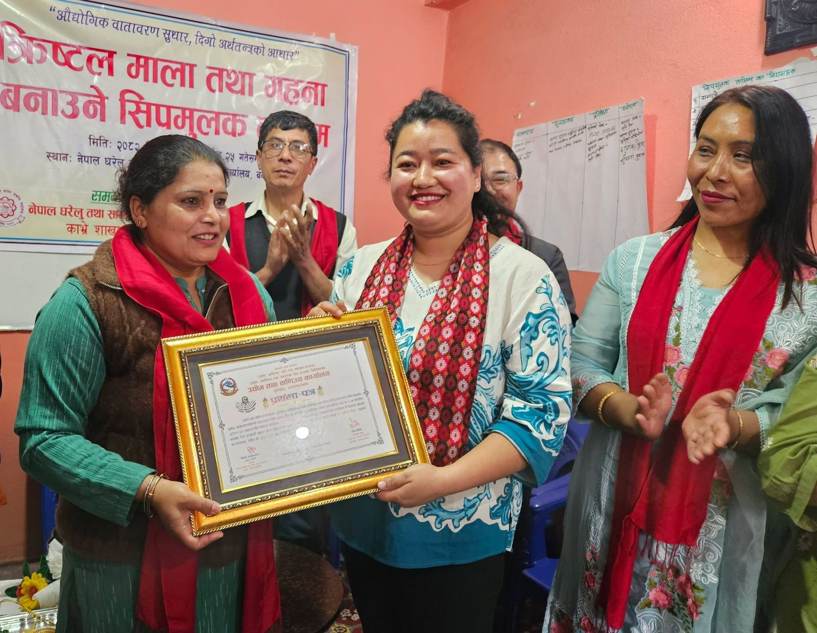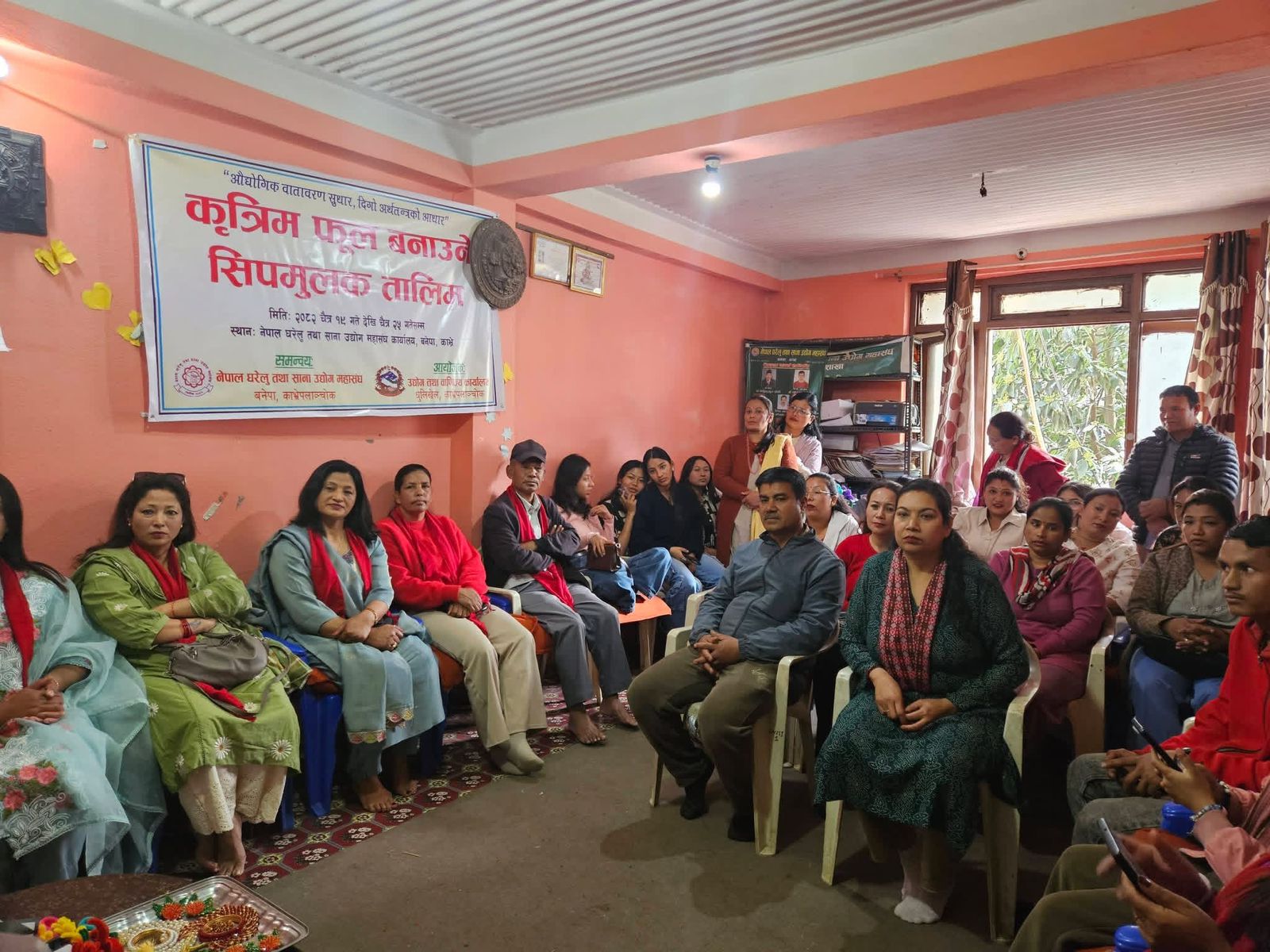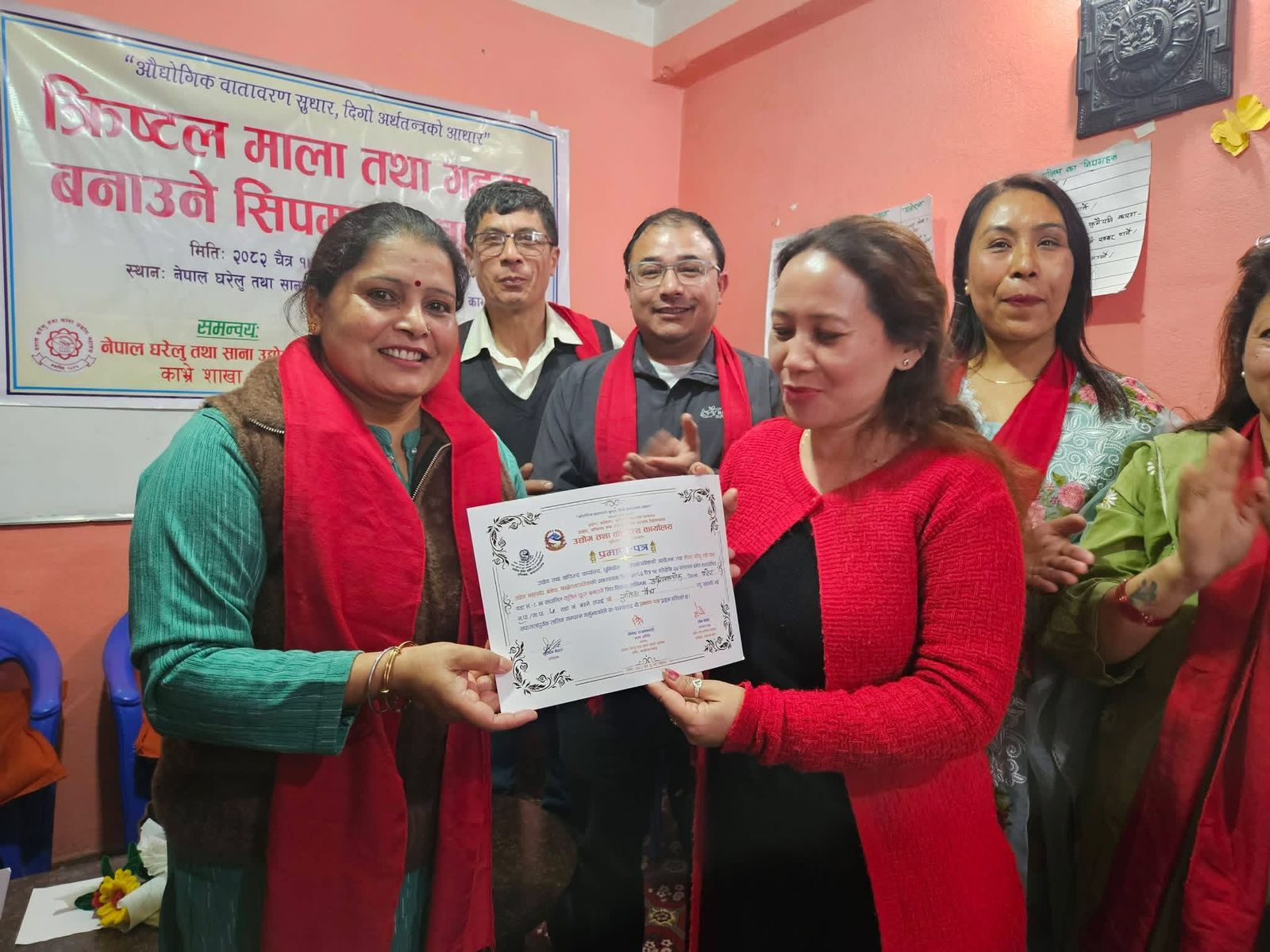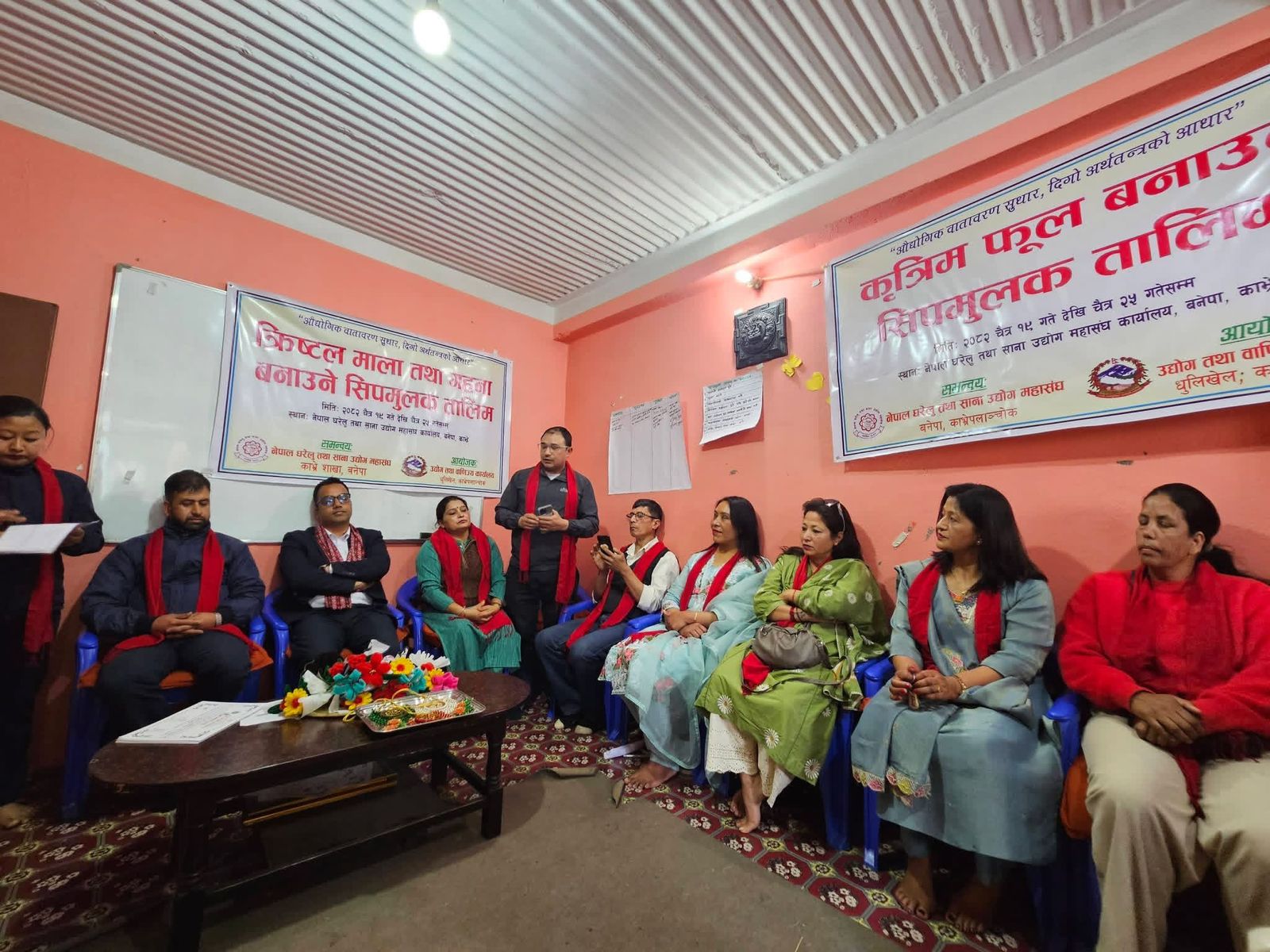 उद्योग तथा वाणिज्य कार्यालय, काभ्रेपलाञ्चोकको आयोजना तथा नेपाल साना तथा घरेलु महासंघ, बनेपा, काभ्रेको सहकार्यमा मिति २०८२।१२।१९ गते देखि मिति २०८२।१२।२५ गतेसम्म क्रिस्टल माला तथा गहना र कृत्रिम फूल बनाउने ७ दिने सीपमूलक तालिम सम्पन्न भएको